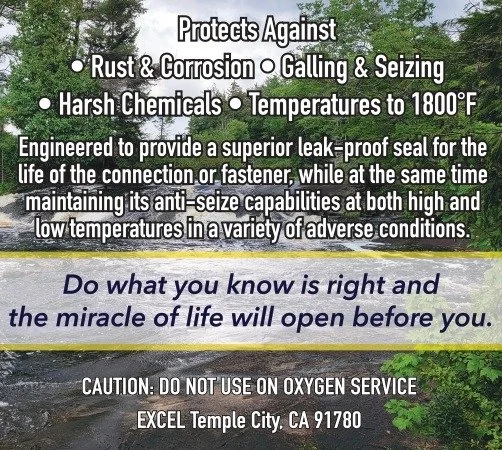 No Forever Chemicals, Non Drying, Seals to 3000 PSI., Meets Food Grade Specs (Incidental food contact), Easily applied, Prevents Seizing and Galling, Stands up to a torch.,Works in cold weather, Applies to a wet thread, A little goes a long way, Able to empty container, Washes off hands and clothes.